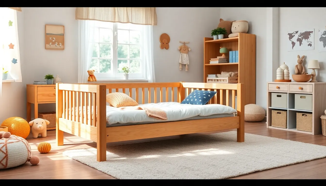 Wooden Montessori toddler beds offer durability and a natural aesthetic that complements various room designs. Common wood types include solid pine, maple, and birch, known for their sturdiness and eco-friendliness. These beds typically feature safe, non-toxic finishes to maintain a healthy sleeping environment. The low-profile design promotes easy access for toddlers, fostering independence. Brands like Lullaby Earth and Oeuf provide excellent examples of wooden beds that meet safety standards while maintaining minimalist charm.